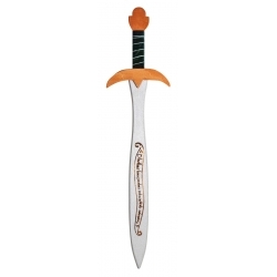 Popis: Dřevěný meč se stříbrnou čepelí a hnědou záštitou a hlavicí zdobený zelenou sametovou omotávkou a nápisem "Jeden prsten vládne všem"